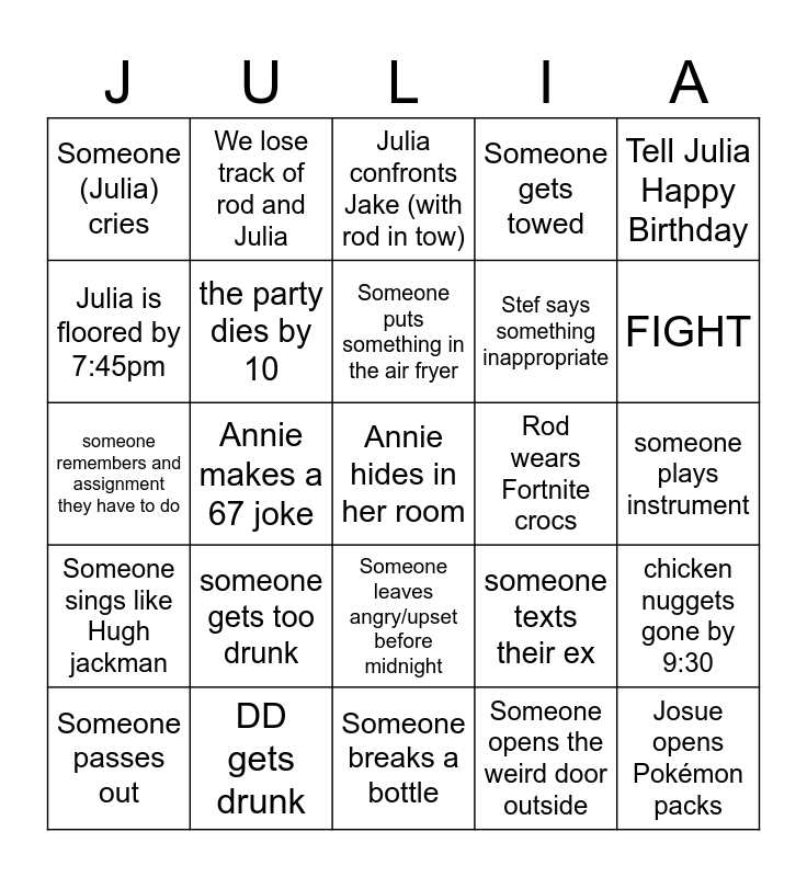 This bingo card has a free space and 25 words: someone gets too drunk, Someone breaks a bottle, Someone puts something in the air fryer, Someone passes out, Tell Julia Happy Birthday, Someone (Julia) cries, Julia is floored by 7:45pm, We lose track of rod and Julia, Rod wears Fortnite crocs, Someone leaves angry/upset before midnight, Stef says something inappropriate, someone remembers and assignment they have to do, someone texts their ex, chicken nuggets gone by 9:30, the party dies by 10, someone gets sick, someone plays instrument, Julia confronts Jake (with rod in tow), FIGHT, Annie makes a 67 joke, Josue opens Pokémon packs, DD gets drunk, Someone sings like Hugh jackman, Someone gets towed and Someone opens the weird door outside.