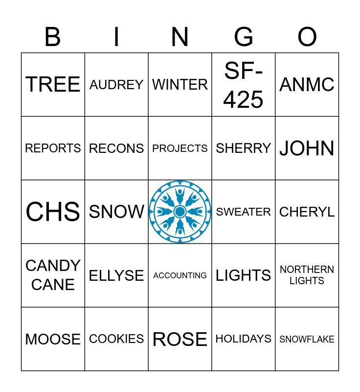 This bingo card has a free space and 35 words: GRANTS, ANTHC, INFOR, RECONS, ACCOUNTING, SF-425, REPORTS, INVOICES, PROJECTS, DEHE, CHS, ANMC, FUNDER, ALASKA, TREE, SWEATER, HOLIDAYS, SNOW, CANDY CANE, SNOWFLAKE, LIGHTS, MOOSE, NORTHERN LIGHTS, COOKIES, WINTER, JOHN, KEISHA, SAMMY, SHERRY, CHERYL, VLADA, ROSE, ELLYSE, AUDREY and DANNY.