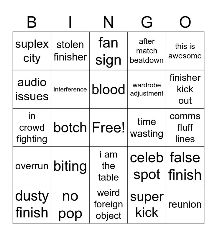 This bingo card has a free space and 37 words: return, meat chant, injury angle, interference, false finish, biting, blood, foreign object, this is awesome, table spot, botch, after match beatdown, reunion, comms fluff lines, audio issues, overrun, low blow, fan sign, i am the table, time wasting, suplex city, finisher kick out, dusty finish, weird foreign object, under the ring, super kick, stolen finisher, swearing, crazy spot, no sell, hulk up, no pop, in crowd fighting, past wrestler ref, celeb spot, wardrobe adjustment and break keyfabe.