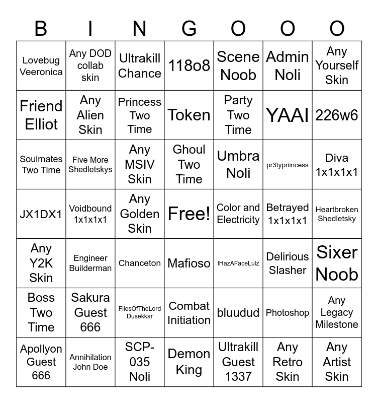 This bingo card has a free space and 48 words: bluudud, YAAI, Demon King, Voidbound 1x1x1x1, Any MSIV Skin, Heartbroken Shedletsky, Any DOD collab skin, Annihilation John Doe, Admin Noli, Mafioso, Any Yourself Skin, 118o8, pr3typriincess, Umbra Noli, Boss Two Time, Betrayed 1x1x1x1, Friend Elliot, 226w6, Photoshop, Scene Noob, Party Two Time, Any Golden Skin, Lovebug Veeronica, Any Alien Skin, Any Legacy Milestone, Princess Two Time, Diva 1x1x1x1, Apollyon Guest 666, Ghoul Two Time, Five More Shedletskys, Any Retro Skin, Color and Electricity, Sixer Noob, Sakura Guest 666, JX1DX1, IHazAFaceLulz, Delirious Slasher, Soulmates Two Time, Chanceton, FliesOfTheLord Dusekkar, Any Y2K Skin, Any Artist Skin, Ultrakill Chance, SCP-035 Noli, Token, Combat Initiation, Engineer Builderman and Ultrakill Guest 1337.