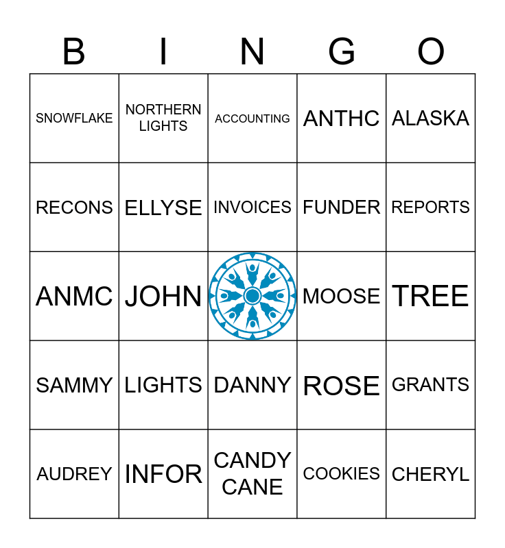 This bingo card has a free space and 35 words: KEISHA, SHERRY, VLADA, ELLYSE, DANNY, ANTHC, RECONS, SF-425, INVOICES, DEHE, ANMC, ALASKA, SWEATER, SNOW, SNOWFLAKE, MOOSE, COOKIES, JOHN, SAMMY, CHERYL, ROSE, AUDREY, GRANTS, INFOR, ACCOUNTING, REPORTS, PROJECTS, CHS, FUNDER, TREE, HOLIDAYS, CANDY CANE, LIGHTS, NORTHERN LIGHTS and WINTER.