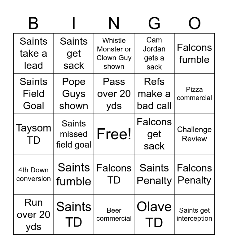 This bingo card has a free space and 24 words: Saints fumble, Saints TD, Pass over 20 yds, Run over 20 yds, Falcons fumble, Saints take a lead, Saints Field Goal, Saints get sack, Falcons get sack, Falcons TD, Refs make a bad call, Taysom TD, Saints Penalty, Falcons Penalty, Pope Guys shown, Olave TD, Challenge Review, Whistle Monster or Clown Guy shown, Pizza commercial, Saints missed field goal, Saints get interception, 4th Down conversion, Cam Jordan gets a sack and Beer commercial.