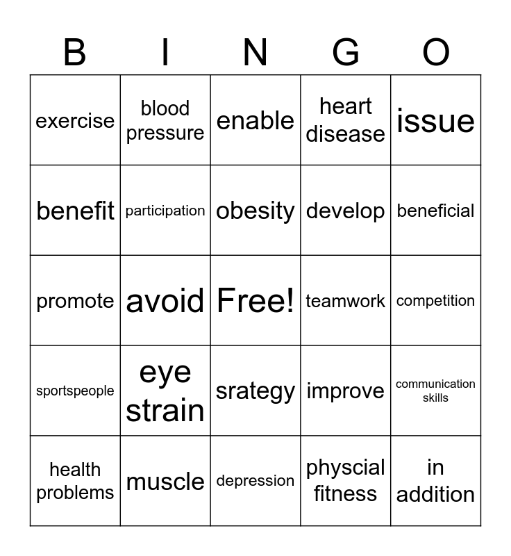 This bingo card has a free space and 24 words: eye strain, muscle, obesity, health problems, issue, exercise, benefit, blood pressure, teamwork, srategy, develop, promote, improve, communication skills, participation, physcial fitness, competition, enable, beneficial, avoid, in addition, sportspeople, heart disease and depression.