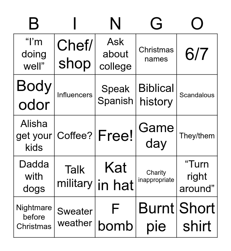 This bingo card has a free space and 24 words: Talk military, Sweater weather, Speak Spanish, Nightmare before Christmas, 6/7, “I’m doing well”, Body odor, Chef/ shop, Game day, Kat in hat, Biblical history, Alisha get your kids, Charity inappropriate, “Turn right around”, Influencers, Burnt pie, They/them, Ask about college, Scandalous, Coffee?, Short shirt, Dadda with dogs, Christmas names and F bomb.