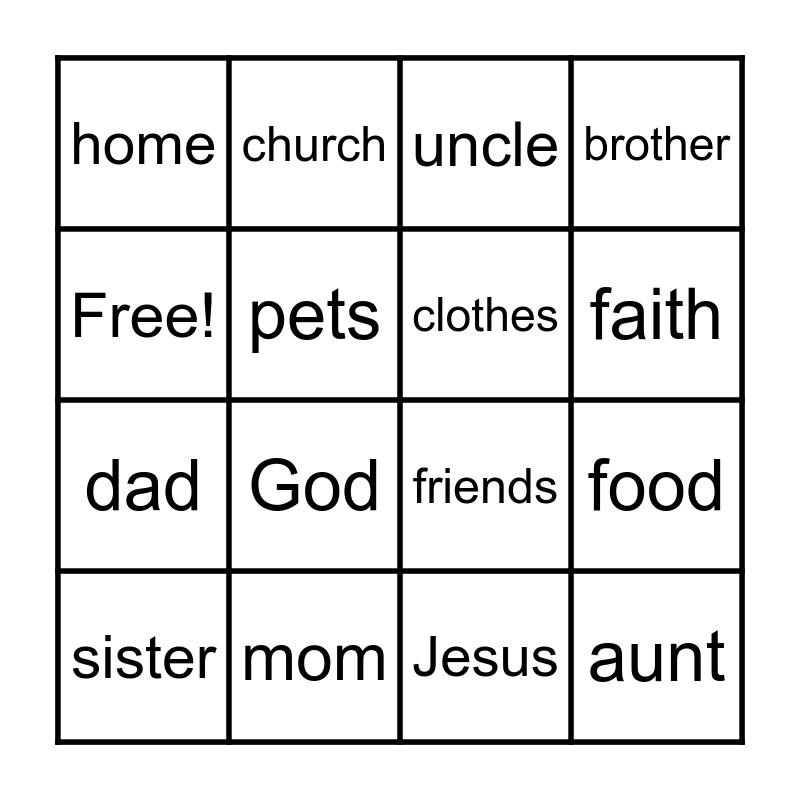 This bingo card has 16 words: mom, food, uncle, home, dad, church, friends, Jesus, Free!, pets, sister, brother, God, faith, clothes and aunt.