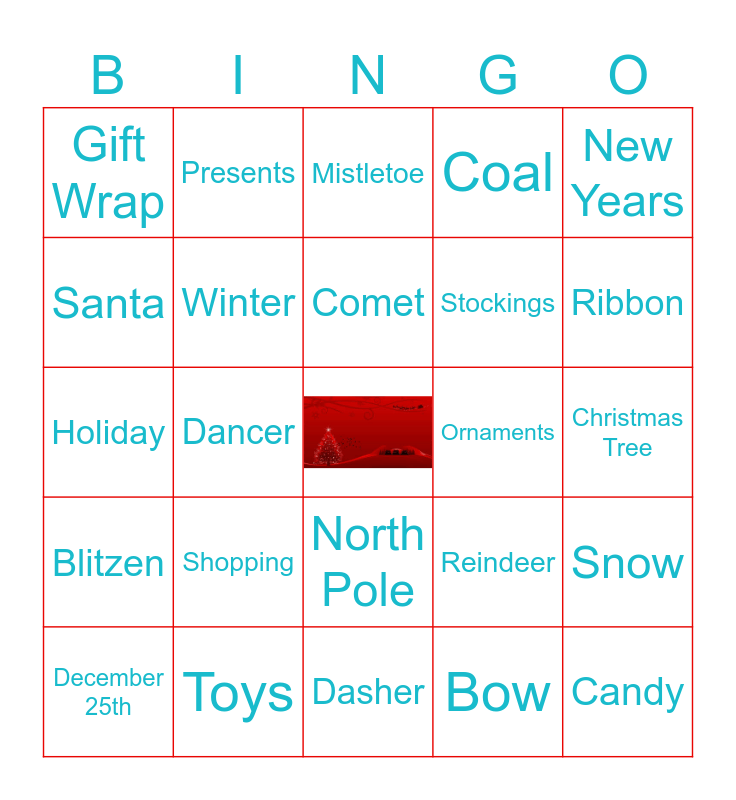 This bingo card has a free space and 27 words: Reindeer, Rudolph, Stockings, Dasher, Santa, Mistletoe, Presents, Blitzen, Ornaments, Snow, Holiday, Coal, December 25th, Toys, Ribbon, Prancer, Winter, Comet, Shopping, Gift Wrap, Christmas Tree, Bow, Dancer, Candy, North Pole, New Years and Cupid.