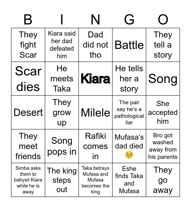 This bingo card has a free space and 24 words: Song pops in, The king steps out, Kiara, Simba asks them to babysit Kiara while he is away, They tell a story, They fight Scar, Scar dies, Kiara said her dad defeated him, The pair say he’s a pathological liar, Rafiki comes in, He tells her a story, Desert, Mufasa’s dad died 🥺, Bro got washed away from his parents, He meets Taka, Eshe finds Taka and Mufasa, She accepted him, Dad did not tho, Song, They grow up, They go away, They meet friends, Battle and Taka betrays Mufasa and Mufasa becomes the king.