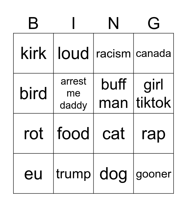 This bingo card has 16 words: trump, rap, racism, kirk, rot, loud, cat, dog, bird, arrest me daddy, eu, canada, food, girl tiktok, buff man and gooner.