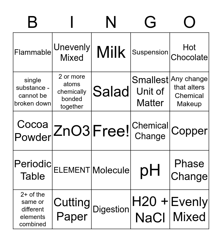 This bingo card has a free space and 24 words: ELEMENT, Cutting Paper, Salad, 2+ of the same or different elements combined, Hot Chocolate, Flammable, single substance -cannot be broken down, Unevenly Mixed, Chemical Change, Molecule, Smallest Unit of Matter, Cocoa Powder, pH, Phase Change, 2 or more atoms chemically bonded together, H20 + NaCl, Copper, Milk, Any change that alters Chemical Makeup, ZnO3, Evenly Mixed, Periodic Table, Suspension and Digestion.