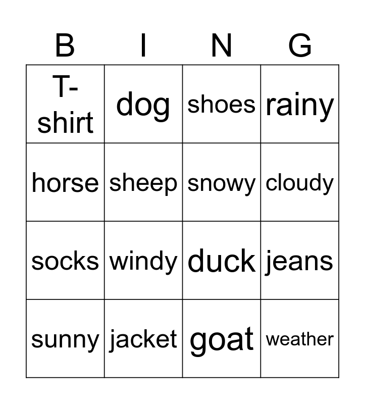 This bingo card has 16 words: jacket, jeans, shoes, T-shirt, socks, dog, duck, goat, horse, sheep, sunny, rainy, windy, cloudy, snowy and weather.