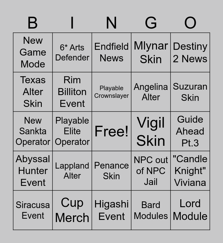 This bingo card has a free space and 24 words: Siracusa Event, Lappland Alter, Playable Crownslayer, Bard Modules, Destiny 2 News, New Game Mode, 6* Arts Defender, Endfield News, Vigil Skin, Guide Ahead Pt.3, New Sankta Operator, Rim Billiton Event, NPC out of NPC Jail, "Candle Knight" Viviana, Texas Alter Skin, Cup Merch, Higashi Event, Mlynar Skin, Suzuran Skin, Abyssal Hunter Event, Playable Elite Operator, Penance Skin, Angelina Alter and Lord Module.