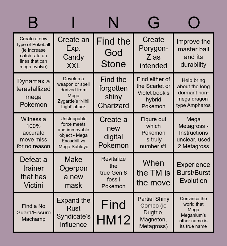 This bingo card has a free space and 24 words: Make Ogerpon a new mask, Expand the Rust Syndicate’s influence, Find the forgotten shiny Charizard, Find a No Guard/Fissure Machamp, Improve the master ball and its durability, Create a new type of Pokeball (ie Increase catch rate on lines that can mega evolve), Dynamax a terastallized mega Pokemon, Create an Exp. Candy XXL, Figure out which Pokemon is truly number #1, Revitalize the true Gen 8 fossil Pokemon, Find either of the Scarlet or Violet book’s hybrid Pokemon, Witness a 100% accurate move miss for no reason, When the TM is the move, Experience Burst/Burst Evolution, Develop a weapon or spell derived from Mega Zygarde’s ‘Nihil Light’ attack, Partial Shiny Combo (ie Dugtrio, Magneton, Metagross), Mega Metagross - Instructions unclear, used 2 Metagross, Find the God Stone, Help bring about the long dormant non-mega dragon-type Ampharos, Unstoppable force meets and immovable object - Mega Excadrill vs Mega Sableye, Convince the world that Mega Meganium’s other name is its true name, Defeat a trainer that has Victini, Create Porygon-Z as intended and Find HM12.
