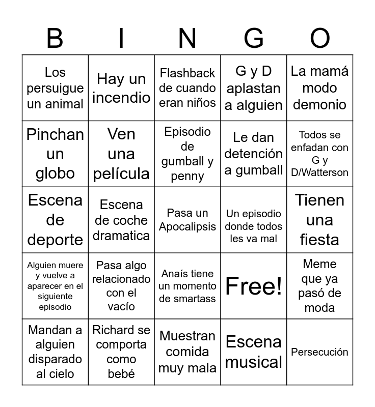 This bingo card has 25 words: Pasa algo relacionado con el vacío, Muestran comida muy mala, Episodio de gumball y penny, Mandan a alguien disparado al cielo, La mamá modo demonio, Los persuigue un animal, Pinchan un globo, Hay un incendio, Un episodio donde todos les va mal, Anaís tiene un momento de smartass, Le dan detención a gumball, Escena de deporte, Free!, Meme que ya pasó de moda, Ven una película, Persecución, Tienen una fiesta, Flashback de cuando eran niños, Todos se enfadan con G y D/Watterson, Escena de coche dramatica, Pasa un Apocalipsis, Richard se comporta como bebé, Alguien muere y vuelve a aparecer en el siguiente episodio, G y D aplastan a alguien and Escena musical.