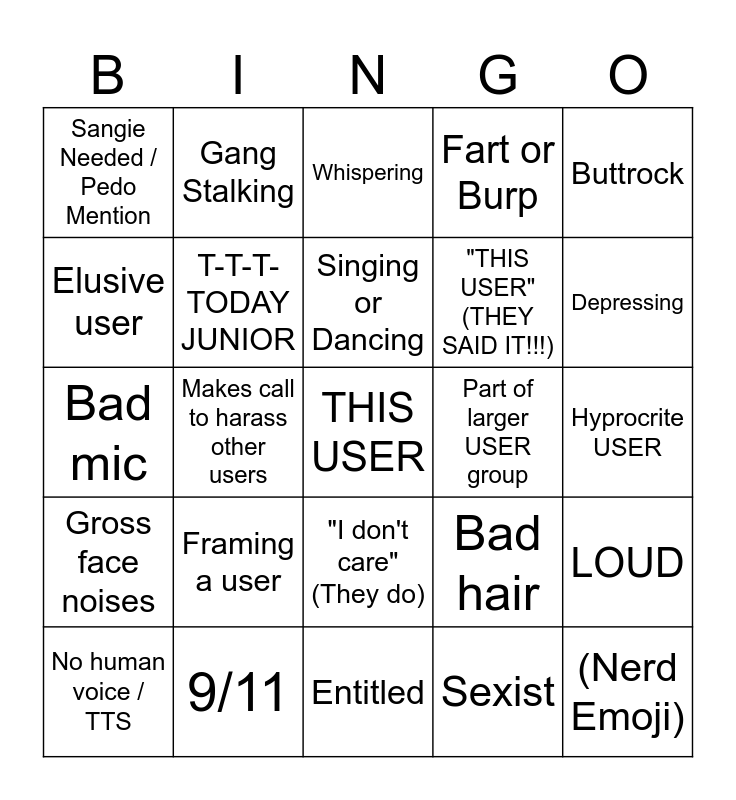 This bingo card has a free space and 24 words: Framing a user, 9/11, Singing or Dancing, No human voice / TTS, Buttrock, Sangie Needed / Pedo Mention, Elusive user, Gang Stalking, Part of larger USER group, "I don't care" (They do), "THIS USER" (THEY SAID IT!!!), Bad mic, Bad hair, LOUD, T-T-T-TODAY JUNIOR, Sexist, Hyprocrite USER, Whispering, Depressing, Makes call to harass other users, (Nerd Emoji), Gross face noises, Fart or Burp and Entitled.