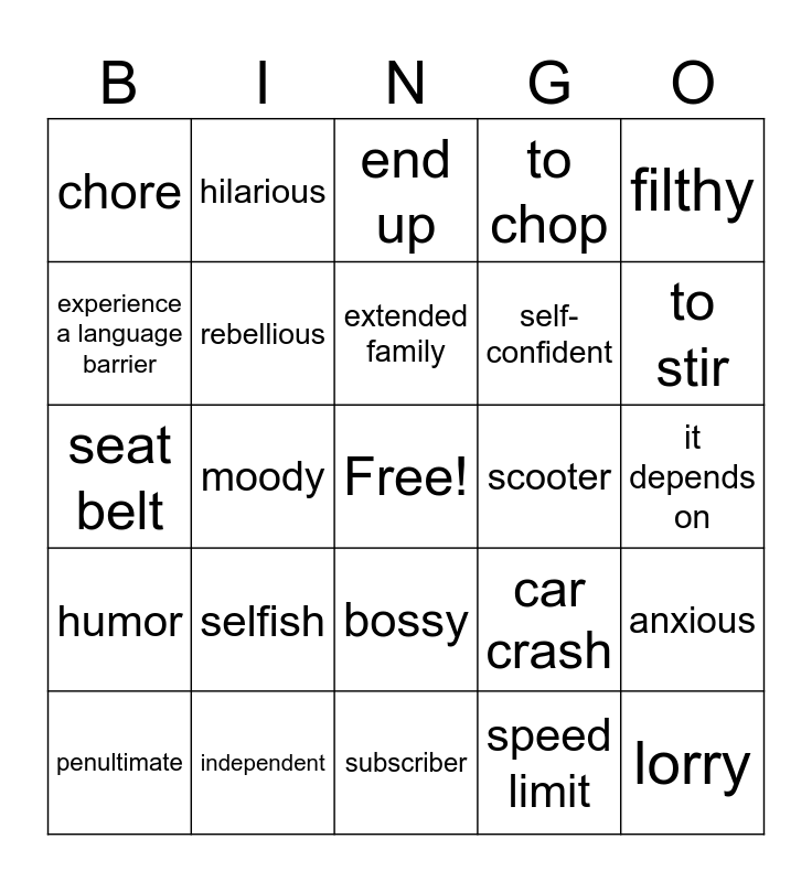 This bingo card has a free space and 24 words: selfish, independent, extended family, penultimate, filthy, chore, experience a language barrier, hilarious, scooter, bossy, self-confident, seat belt, car crash, anxious, rebellious, speed limit, it depends on, end up, to stir, moody, lorry, humor, to chop and subscriber.