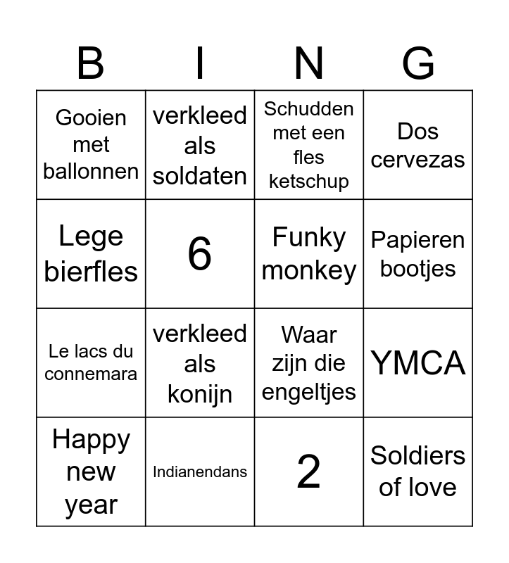 This bingo card has 16 words: Indianendans, YMCA, Schudden met een fles ketschup, Gooien met ballonnen, Le lacs du connemara, verkleed als soldaten, Waar zijn die engeltjes, 2, Lege bierfles, 6, Happy new year, Dos cervezas, verkleed als konijn, Papieren bootjes, Funky monkey and Soldiers of love.
