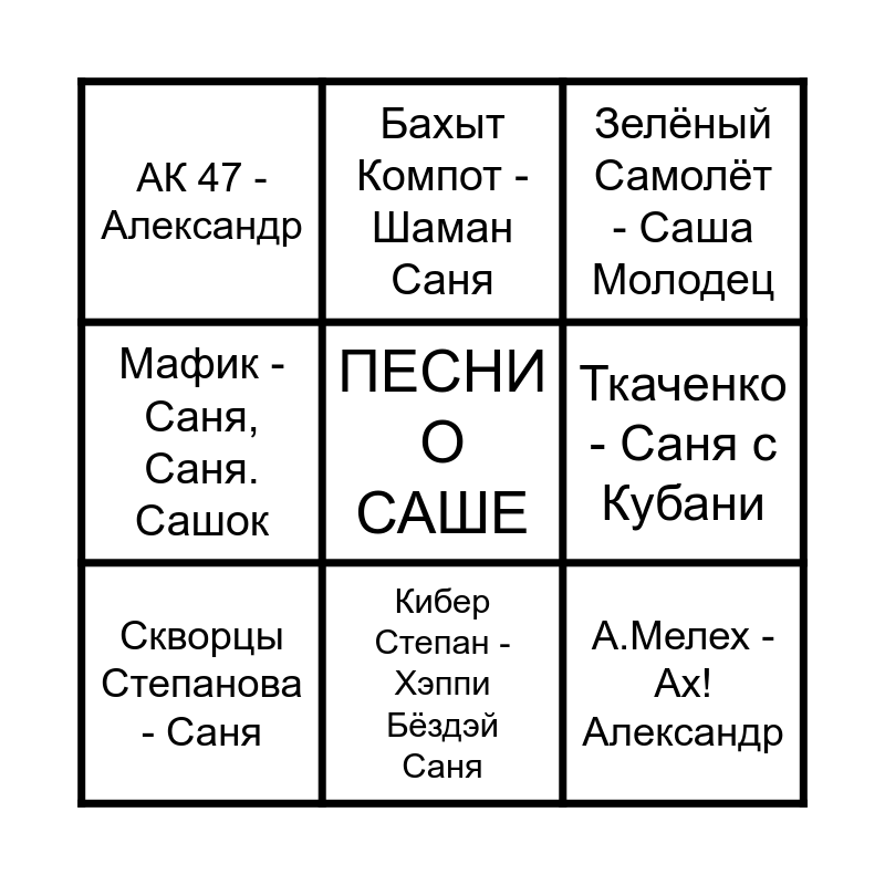 This bingo card has a free space and 11 words: ТОЛЬКО ПЕСНИ, Кибер Степан - Хэппи Бёздэй Саня, А.Мелех - Ах!Александр, Скворцы Степанова - Саня, Бахыт Компот - Шаман Саня, Зелёный Самолёт - Саша Молодец, Ткаченко - Саня с Кубани, ТОЛЬКО О САШЕ, Мафик - Саня, Саня. Сашок, АК 47 - Александр and Краски - Сашка.