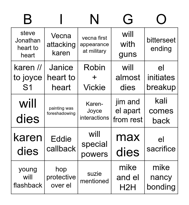 This bingo card has a free space and 24 words: Eddie callback, hop protective over el, Robin + Vickie, young will flashback, bitterseet ending, steve Jonathan heart to heart, karen // to joyce S1, Vecna attacking karen, jim and el apart from rest, will special powers, will almost dies, will dies, max dies, el sacrifice, Janice heart to heart, mike and el H2H, kali comes back, vecna first appearance at military, el initiates breakup, painting was foreshadowing, mike nancy bonding, karen dies, will with guns and suzie mentioned.