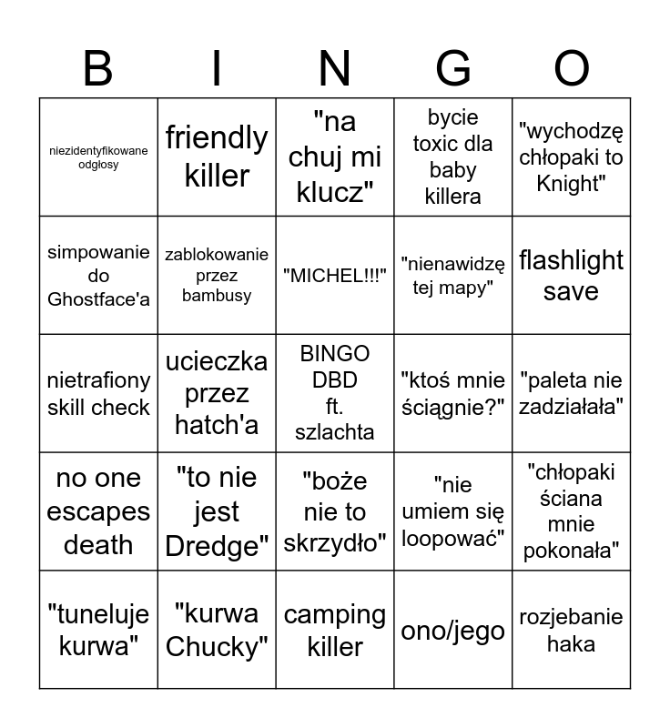 This bingo card has a free space and 24 words: "to nie jest Dredge", "kurwa Chucky", "MICHEL!!!", "tuneluje kurwa", "wychodzę chłopaki to Knight", niezidentyfikowane odgłosy, simpowanie do Ghostface'a, friendly killer, "ktoś mnie ściągnie?", "boże nie to skrzydło", "nienawidzę tej mapy", nietrafiony skill check, "nie umiem się loopować", "chłopaki ściana mnie pokonała", zablokowanie przez bambusy, ono/jego, "paleta nie zadziałała", "na chuj mi klucz", flashlight save, ucieczka przez hatch'a, rozjebanie haka, no one escapes death, bycie toxic dla baby killera and camping killer.