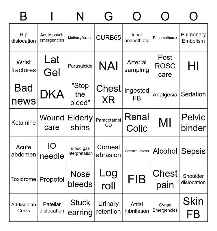 This bingo card has a free space and 48 words: Acute abdomen, Wound care, Stuck earring, Corneal abrasion, Arterial samplnig, MI, Pulmonary Embolism, Addisonian Crisis, DKA, Elderly shins, CURB65, local anaesthetic, Analgesia, Sedation, Ketamine, Propofol, Methoxyflurane, Chest XR, FIB, Pneumothorax, HI, Wrist fractures, Acute psych emergencies, Parasuicide, Atrial Fibrillation, Post ROSC care, Pelvic binder, Toxidrome, IO needle, "Stop the bleed", Log roll, Ingested FB, Chest pain, Shoulder dislocation, Hip dislocation, Patellar dislocation, Blood gas interpretation, Urinary retention, Renal Colic, Gynae Emergencies, Sepsis, Bad news, Lat Gel, Nose bleeds, NAI, Consciousness, Alcohol and Skin FB.