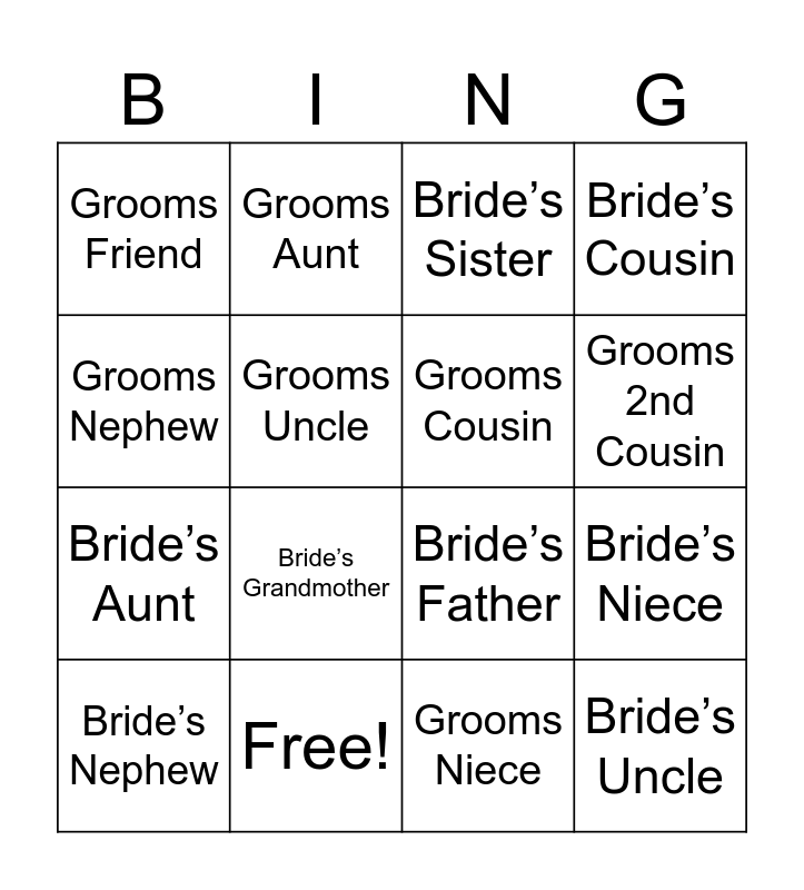 This bingo card has 22 words: Free!, Grooms Sister, Grooms Aunt, Grooms Father, Grooms Uncle, Grooms Cousin, Grooms Friend, Bride’s Sister, Bride’s Father, Bride’s Uncle, Bride’s Aunt, Bride’s Cousin, Bride’s Mother, Grooms Mother, Grooms Niece, Bride’s Friend, Bride’s Niece, Bride’s Nephew, Bride’s Grandmother, Grooms Nephew, Grooms 2nd Cousin and Bride’s 2nd Cousin.