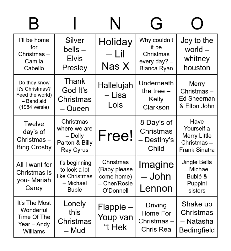 This bingo card has a free space and 58 words: Last Christmas – Wham, Lonely this Christmas – Mud, Oh holy night – Nat King Cole, All I want for Christmas is you- Mariah Carey, Driving Home For Christmas – Chris Rea, Santa Claus Is Comin’ to Town – Mariah Carey, Thank God It’s Christmas – Queen, Christmas lights – Coldplay, Underneath the tree – Kelly Clarkson, Felize navidad – Jose Feliciano, Why couldn’t it be Christmas every day? – Bianca Ryan, Santa Tell Me – Ariana Grande, What Christmas means to me – John Legend, Stevie Wonder, Misletoe – Justin Bieber, Wonderful Christmas Time – Paul McCartney, I’ll be home for Christmas – Camila Cabello, Shake up Christmas – Natasha Bedingfield, Joy to the world – whitney houston, It’s Gonna Be A Cold, Cold Christmas – Dana, Hallelujah – Lisa Lois, 8 Day’s of Christmas – Destiny’s Child, Holiday – Lil Nas X, It’s The Most Wonderful Time Of The Year – Andy Williams, Jingle Bells – Michael Bublé & Puppini sisters, This one’s for the children – New kids on the block, Have Yourself a Merry Little Christmas – Frank Sinatra, Sleigh Ride – The Ronettes, Being Alone At Christmas – Miss Montreal, Merry Christmas – Ed Sheernan & Elton John, Happy xmas (War is over) – John Lennon, Merry Christmas everybody – Robbie Williams & Jamie Cullum, Christmas time – Bryan Adams, Winter wonderland – Dean Martin, Rocking around the Christmas three -Miley Cyrus, I met an angel on Christmas day- Celine Dion, Let it snow let it snow let it snow – Dean Martin, Christmas on my doorsteps – OG3NE, Christmas where we are – Dolly Parton & Billy Ray Cyrus, Twelve day’s of Christmas – Bing Crosby, Rudolph the rednose reindeer – Sammy Kaye, It’s beginning to look a lot like Christmas – Michael Buble, My only wish this year – Britney Spears, Imagine – John Lennon, Als de eerste sneeuw valt Emma Heester, Mr Snowman – Sia, You make it feel like Christmas – Gwen Stefani & Blake Shelton, I believe in father Chritsmas – U2, Christmas (Baby please come home) – Cher/Rosie O’Donnell, Flappie – Youp van “t Hek, Silent Night – Julie Andrews, Kerstcadeau – Nielson, This Christmas – Mary J Blige, Bad Sharon – Robbie Williams , Tyson Fury, Mary’s boy child – boney m, Silver bells – Elvis Presley, Stop The Cavalry – Jona Lewie, Do they know it’s Christmas? Feed the world) – Band aid (1984 versie) and When a child is born – Sinead O’Conner.