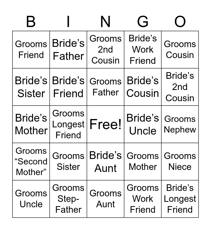 This bingo card has a free space and 25 words: Grooms Sister, Grooms Aunt, Grooms Father, Grooms Uncle, Grooms Cousin, Grooms Friend, Bride’s Sister, Bride’s Father, Bride’s Uncle, Bride’s Aunt, Bride’s Cousin, Bride’s Mother, Grooms Mother, Grooms Niece, Bride’s Friend, Bride’s Niece, Grooms Nephew, Grooms 2nd Cousin, Bride’s 2nd Cousin, Grooms Longest Friend, Bride’s Longest Friend, Grooms Step-Father, Grooms “Second Mother”, Bride’s Work Friend and Grooms Work Friend.