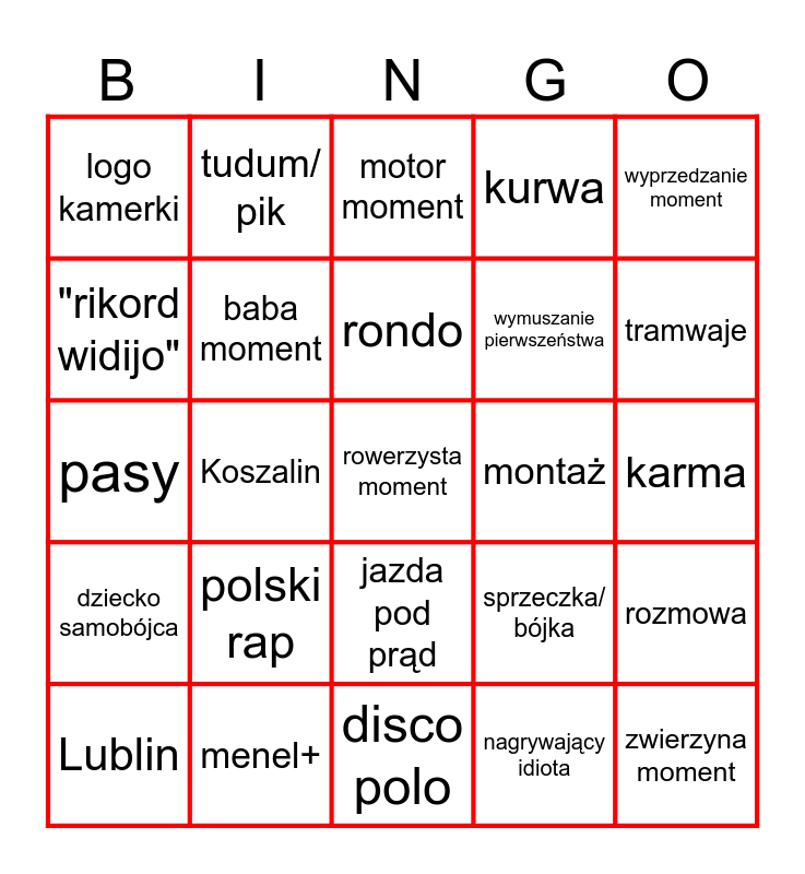 This bingo card has 25 words: polski rap, disco polo, rondo, Lublin, wyprzedzanie moment, logo kamerki, "rikord widijo", tudum/ pik, montaż, jazda pod prąd, wymuszanie pierwszeństwa, pasy, sprzeczka/ bójka, rozmowa, baba moment, zwierzyna moment, karma, motor moment, tramwaje, Koszalin, rowerzysta moment, menel+, dziecko samobójca, kurwa and nagrywający idiota.