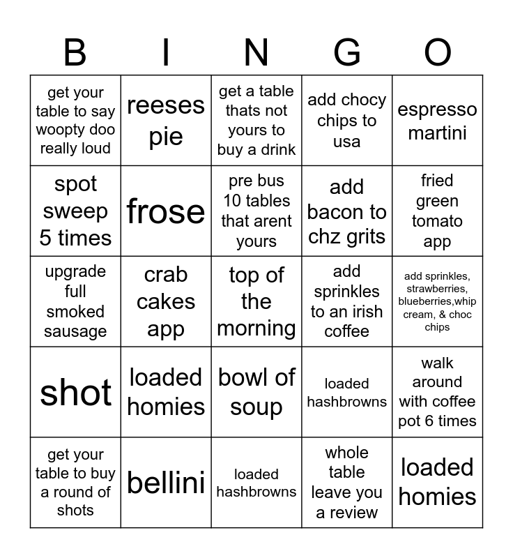 This bingo card has a free space and 24 words: loaded homies, bellini, pre bus 10 tables that arent yours, get your table to buy a round of shots, espresso martini, get your table to say woopty doo really loud, spot sweep 5 times, reeses pie, add sprinkles to an irish coffee, bowl of soup, add bacon to chz grits, upgrade full smoked sausage, loaded hashbrowns, walk around with coffee pot 6 times, frose, whole table leave you a review, add sprinkles, strawberries, blueberries,whip cream, & choc chips, get a table thats not yours to buy a drink, fried green tomato app, crab cakes app, loaded homies, shot, add chocy chips to usa and loaded hashbrowns.