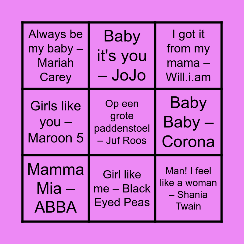 This bingo card has a free space and 8 words: Baby Baby – Corona, I got it from my mama – Will.i.am, Baby it's you – JoJo, Mamma Mia – ABBA, Always be my baby – Mariah Carey, Man! I feel like a woman – Shania Twain, Girls like you – Maroon 5 and Girl like me – Black Eyed Peas.