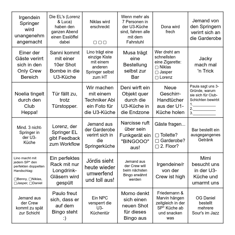 This bingo card has 36 words: Jemand aus der Crew will beim nächsten Bingo erwähnt werden, Jördis sieht heute wieder umwerfend und toll aus!, Momo denkt sich einen neuen Shot für dieses Bingo aus, Einer der Gäste verirrt sich in den Only Crew Bereich, Mind. 3 nicht-Springer in der U3-Küche, Deni wirft ein Objekt quer durch die U3-Küche in die Endzone, Sanni kommt mit einer 10er Shot Bombe in die U3-Küche, Ein NPC versperrt die U3-Küchentür, Dona wird frech, Irgendeine/r von der Crew ist high, Jacky mach mal 'n Trick, Wenn mehr als 7 Personen in der U3-Küche sind, fahren alle mit dem Fahrstuhl, Mimi besucht uns in der U3-Küche und umarmt uns, Tür fällt zu, trotz Türstopper., Musa trägt eine Bestellung selbst zur Bar, Irgendein Springer wird unangenehm angemacht, Lino macht mit jedem SP* den perfekten doppelten Handschlag: ▢Benny, ▢Niklas, ▢Jasper, ▢Daniel, Neue Geschirr-Handtücher aus der U1-Küche holen, Noelia tingelt durch den Club Heppa!, Niklas wird erschreckt ▢ ▢ ▢, Wir machen mit einem Techniker Abi ein Foto für die U3-Küche, Lorenz, der Springer EL gibt Feedback zum Workflow, Narcisse ruft über sein Funkgerät ein "BINGOOO" aus!, Jemand aus der Garderobe verirrt sich in die Springerküche, Gäste fragen... ▢ Toilette? ▢ Garderobe? ▢ 2. Floor?, Die EL's (Lorenz & Luca) haben den ganzen Abend einen Esslöffel dabei, Wer dreht am schnellsten eine Zigarette: ▢ Niklas ▢ Jasper ▢ Lorenz, Paulo freut sich, dass er auf dem Bingo steht :), Lino trägt eine einzige Kiste mit einem anderen Springer selbst zum HT, Jemand von den Springern verirrt sich an die Garderobe, OG Daniel bestellt mehrere Sour's im Jazz, Jemand aus der Crew kommt zu spät zur Schicht, Bar bestellt ein ausgegangenes Getränk, Paula sagt uns 3- Gründe, warum sie sich für Club-Schichten bewirbt 1.___________ 2.___________ 3.___________, Ein perfektes Rack mit nur Longdrink- Gläsern wird gespült and Friedemann & Marvin hängen zeitgleich in der SP* Küche ab und snacken was.