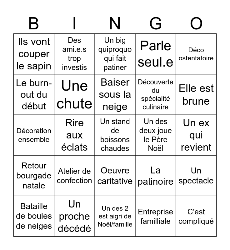 This bingo card has 25 words: Atelier de confection, Un des 2 est aigri de Noël/famille, Baiser sous la neige, Bataille de boules de neiges, Déco ostentatoire, Ils vont couper le sapin, Le burn-out du début, Des ami.e.s trop investis, Un des deux joue le Père Noël, Oeuvre caritative, Découverte du spécialité culinaire, Décoration ensemble, La patinoire, Un spectacle, Une chute, C'est compliqué, Un ex qui revient, Un big quiproquo qui fait patiner, Elle est brune, Rire aux éclats, Un stand de boissons chaudes, Un proche décédé, Retour bourgade natale, Parle seul.e and Entreprise familliale.