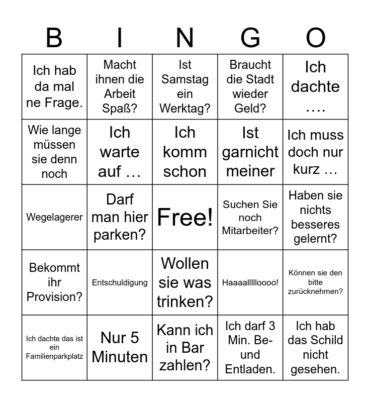This bingo card has a free space and 27 words: Haaaallllloooo!, Was kostet das denn?, Ist garnicht meiner, Kann ich in Bar zahlen?, Wie lange müssen sie denn noch, Ist Samstag ein Werktag?, Macht ihnen die Arbeit Spaß?, Bekommt ihr Provision?, Suchen Sie noch Mitarbeiter?, Können sie den bitte zurücknehmen?, Wegelagerer, Braucht die Stadt wieder Geld?, Ich dachte das ist ein Familienparkplatz, Nur 5 Minuten, Ich muss doch nur kurz …, Haben sie mich schon verwarnt?, Ich warte auf …, Ich komm schon, Entschuldigung, Ich hab da mal ne Frage., Haben sie nichts besseres gelernt?, Ich darf 3 Min. Be- und Entladen., Darf man hier parken?, Ich hab das Schild nicht gesehen., Wollen sie was trinken?, Ich dachte …. and Ich fahr doch weg wenn jemand kommt..