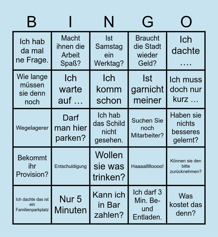 This bingo card has 27 words: Haaaallllloooo!, Was kostet das denn?, Ist garnicht meiner, Kann ich in Bar zahlen?, Wie lange müssen sie denn noch, Ist Samstag ein Werktag?, Macht ihnen die Arbeit Spaß?, Bekommt ihr Provision?, Suchen Sie noch Mitarbeiter?, Können sie den bitte zurücknehmen?, Wegelagerer, Braucht die Stadt wieder Geld?, Ich dachte das ist ein Familienparkplatz, Nur 5 Minuten, Ich muss doch nur kurz …, Haben sie mich schon verwarnt?, Ich warte auf …, Ich komm schon, Entschuldigung, Ich hab da mal ne Frage., Haben sie nichts besseres gelernt?, Ich darf 3 Min. Be- und Entladen., Darf man hier parken?, Ich hab das Schild nicht gesehen., Wollen sie was trinken?, Ich dachte …. and Ich fahr doch weg wenn jemand kommt..