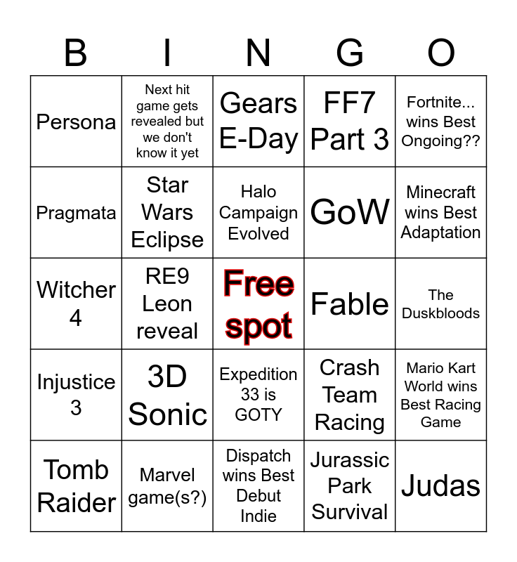 This bingo card has a free space and 24 words: 3D Sonic, Marvel game(s?), Halo Campaign Evolved, Tomb Raider, Fortnite... wins Best Ongoing??, Persona, Pragmata, Next hit game gets revealed but we don't know it yet, Fable, Expedition 33 is GOTY, GoW, Witcher 4, Crash Team Racing, Mario Kart World wins Best Racing Game, Star Wars Eclipse, Jurassic Park Survival, The Duskbloods, Gears E-Day, Minecraft wins Best Adaptation, RE9 Leon reveal, Judas, Injustice 3, FF7 Part 3 and Dispatch wins Best Debut Indie.