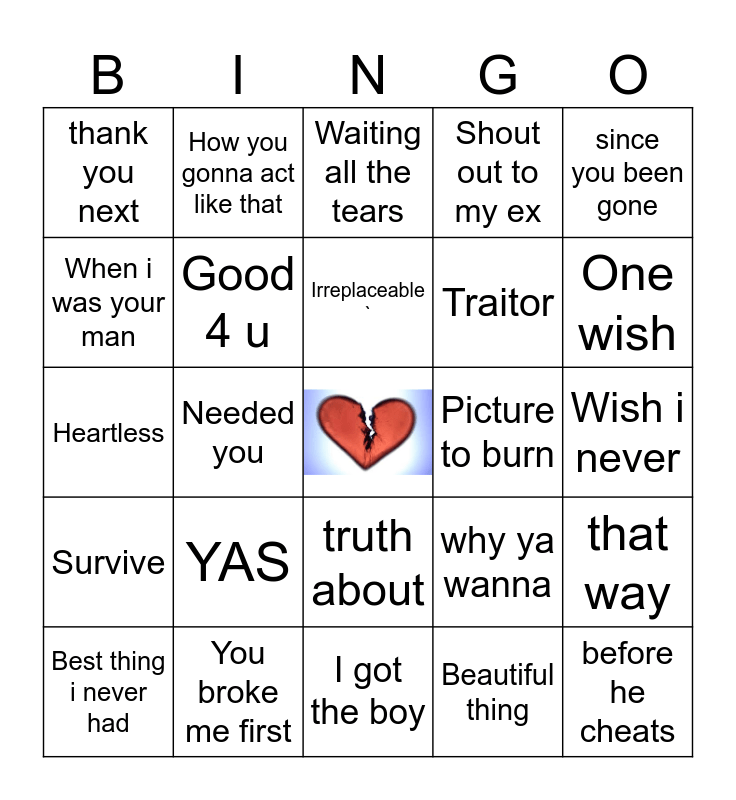 This bingo card has a free space and 59 words: Wish you the best, You broke me first, Vampire, Survive, Beautiful thing, Someone you loved, Good 4 u, Exes, Traitor, Happier then ever, Shout out to my ex, I hope, When i was your man, i hate you i love you, Deja vu, thank you next, before he cheats, since you been gone, hold On, Irreplaceable `, Picture to burn, Waiting all the tears, Best thing i never had, that way, Without me, leave (get Out), Too little to late, You should be sad, One wish, We belong together, Foolish, Karma, needed me, I bet, How you gonna act like that, so sick, I should’ve cheated, Needed you, We are never ever getting back togather, Heartless, I hate u, YAS, Wish i never, Mamas broken heart, What hurts the most, Tomorrow, Breakup in a small town, Goodbye looks good on you, truth about, I got the boy, a little bit stronger, more hearts then mine, bandaid on a bullet hole, here comes goodbye, Die from a broken heart, why ya wanna, consider me gone, if i were a boy and what he didn’t do.