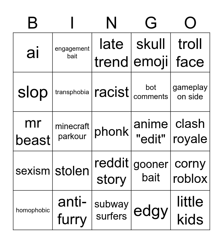This bingo card has a free space and 24 words: stolen, anti-furry, racist, homophobic, troll face, ai, slop, engagement bait, anime "edit", reddit story, bot comments, mr beast, gooner bait, corny roblox, transphobia, edgy, clash royale, late trend, gameplay on side, minecraft parkour, little kids, sexism, skull emoji and subway surfers.