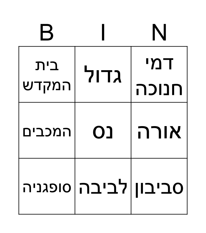 This bingo card has a free space and 14 words: פך השמן, חנוכייה, סופגניה, גדול, המכבים, סביבון, פה, היה, לביבה, בית המקדש, נרות, אורה, דמי חנוכה and הדלקה.