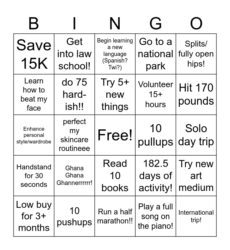 This bingo card has a free space and 24 words: Low buy for 3+ months, Ghana Ghana Ghannerrrrrr!, Try 5+ new things, Play a full song on the piano!, Splits/ fully open hips!, Save 15K, Get into law school!, Begin learning a new language (Spanish? Twi?), 10 pullups, Solo day trip, Enhance personal style/wardrobe, do 75 hard-ish!!, 182.5 days of activity!, Try new art medium, Learn how to beat my face, 10 pushups, Run a half marathon!!, Go to a national park, Hit 170 pounds, Handstand for 30 seconds, perfect my skincare routineee, Read 10 books, Volunteer 15+ hours and International trip!.