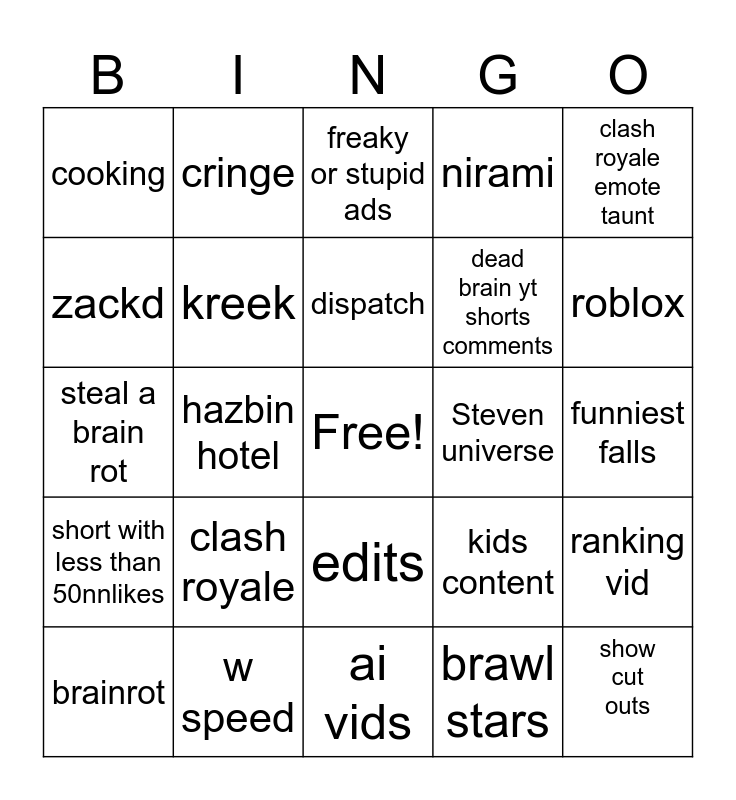 This bingo card has a free space and 24 words: clash royale, w speed, dispatch, brainrot, clash royale emote taunt, cooking, zackd, cringe, Steven universe, edits, dead brain yt shorts comments, steal a brain rot, kids content, ranking vid, kreek, brawl stars, funniest falls, freaky or stupid ads, roblox, hazbin hotel, show cut outs, short with less than 50nnlikes, nirami and ai vids.