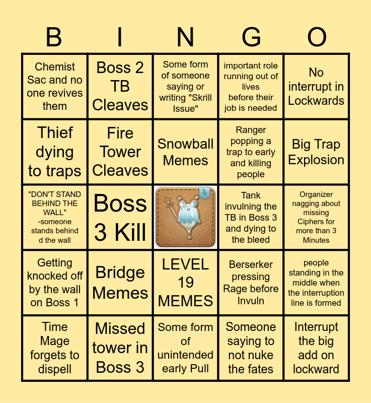 This bingo card has a free space and 24 words: Bridge Memes, Missed tower in Boss 3, Snowball Memes, Time Mage forgets to dispell, No interrupt in Lockwards, Chemist Sac and no one revives them, Thief dying to traps, Boss 2 TB Cleaves, Tank invulning the TB in Boss 3 and dying to the bleed, LEVEL 19 MEMES, Ranger popping a trap to early and killing people, "DON'T STAND BEHIND THE WALL" -someone stands behind d the wall, Berserker pressing Rage before Invuln, people standing in the middle when the interruption line is formed, Fire Tower Cleaves, Someone saying to not nuke the fates, Organizer nagging about missing Ciphers for more than 3 Minutes, Some form of someone saying or writing "Skrill Issue", Big Trap Explosion, Boss 3 Kill, Interrupt the big add on lockward, Getting knocked off by the wall on Boss 1, important role running out of lives before their job is needed and Some form of unintended early Pull.