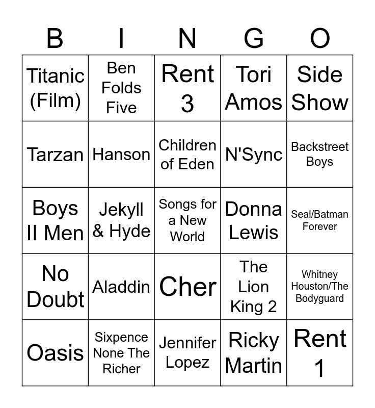 This bingo card has 75 words: The Lion King 1, A New Brain, Rent 3, Beauty & Beast, Parade, Floyd Collins, My Favorite Year/Backstreet Boys, The Who's Tommy, The Secret Garden, Titanic (Musical), Rent 1, Ragtime, Children of Eden, Tarzan, Assassins, Jekyll & Hyde, Rent 2, Songs for a New World, Sunset Boulevard, Side Show, Los del Rio, Boys II Men, Hanson, Ben Folds Five, Tori Amos, 98 Degrees, Friends, Goo Goo Dolls, Crash Test Dummies, Third Eye Blind, Savage Garden, TLC 1, The Cranberries, The Lion King 2, Backstreet Boys, N'Sync, Smash Mouth, Metallica, Seal/Batman Forever, Ricky Martin, Lou Bega, Saved By The Bell, Red Hot Chili Peppers, Nirvana, Santana feat. Rob Thomas, Green Day, Oasis, Titanic (Film), Ace of Bass, Mariah Carey, Blink-182, Cher, Christina Aguilera, Radiohead, Dave Matthews Band, Macy Gray, Alanis Morisette, TLC 2, Faith Hill, Natalie Imbruglia, Aladdin, Spice Girls, Shania Twain, Fiona Apple, Wilson Phillips, Donna Lewis, Britney Spears, Jewel, Paul Cole/Dawson's Creek, Whitney Houston/The Bodyguard, No Doubt, Sixpence None The Richer, Destiny's Child, Jennifer Lopez and The Chicks.