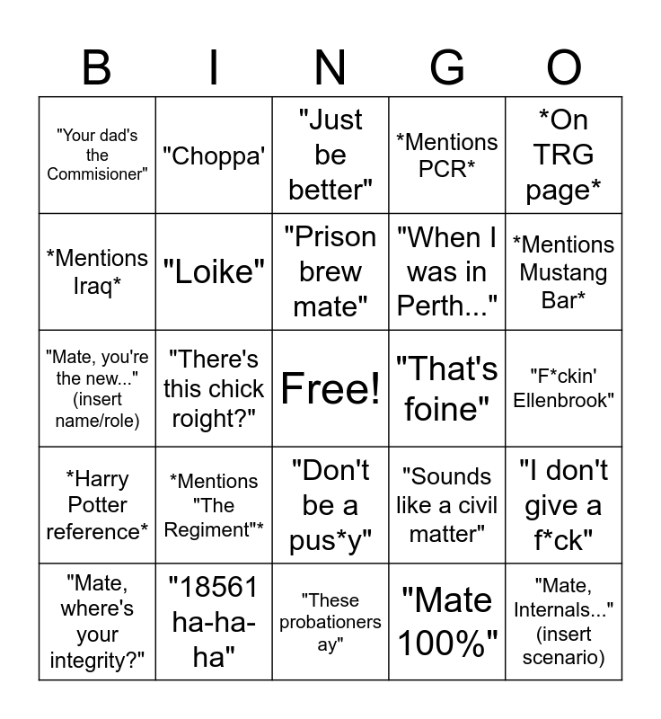 This bingo card has a free space and 24 words: *Mentions "The Regiment"*, "18561 ha-ha-ha", "Prison brew mate", "Mate, where's your integrity?", *On TRG page*, "Your dad's the Commisioner", *Mentions Iraq*, "Choppa', "That's foine", "Don't be a pus*y", "When I was in Perth...", "Mate, you're the new..." (insert name/role), "Sounds like a civil matter", "I don't give a f*ck", "Loike", "Mate 100%", "F*ckin' Ellenbrook", "Just be better", *Mentions Mustang Bar*, "There's this chick roight?", "Mate, Internals..." (insert scenario), *Harry Potter reference*, *Mentions PCR* and "These probationers ay".