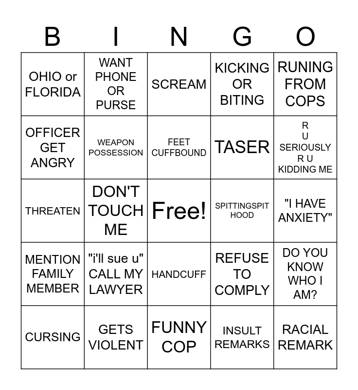 This bingo card has a free space and 24 words: "i'll sue u" CALL MY LAWYER, GETS VIOLENT, FEET CUFFBOUND, CURSING, RUNING FROM COPS, OHIO or FLORIDA, OFFICER GET ANGRY, WANT PHONE OR PURSE, SPITTINGSPIT HOOD, HANDCUFF, TASER, THREATEN, REFUSE TO COMPLY, DO YOU KNOW WHO I AM?, WEAPON POSSESSION, INSULT REMARKS, "I HAVE ANXIETY", SCREAM, R U SERIOUSLY R U KIDDING ME, DON'T TOUCH ME, RACIAL REMARK, MENTION FAMILY MEMBER, KICKING OR BITING and FUNNY COP.