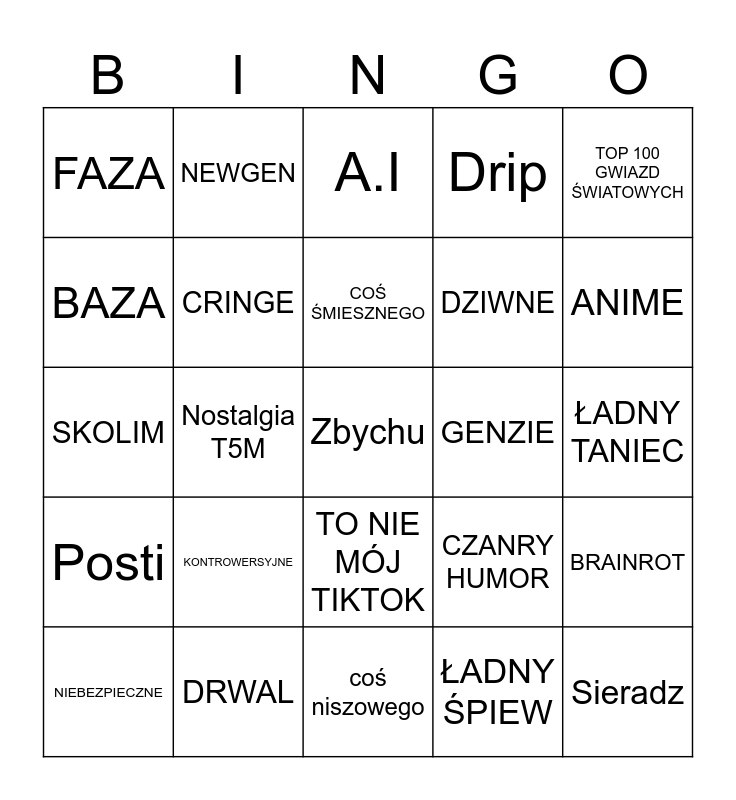 This bingo card has a free space and 24 words: KONTROWERSYJNE, DRWAL, COŚ ŚMIESZNEGO, NIEBEZPIECZNE, TOP 100 GWIAZD ŚWIATOWYCH, FAZA, BAZA, NEWGEN, GENZIE, TO NIE MÓJ TIKTOK, DZIWNE, SKOLIM, CZANRY HUMOR, BRAINROT, CRINGE, ŁADNY ŚPIEW, ŁADNY TANIEC, A.I, ANIME, Nostalgia T5M, Sieradz, Posti, Drip and coś niszowego.