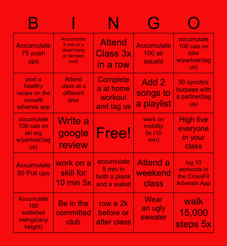 This bingo card has a free space and 29 words: Accumulate 100 kettlebell swings(any height), Bring a Friend, Write a google review, take a photo in CFA gear(tag us), Accumulate 75 push ups, Attend Class 3x in a row, Attend class at a different time, work on a skill for 10 min 5x, work on mobility 5x (10 min), Be in the committed club, High five everyone in your class, walk 15,000 steps 5x, row a 2k before or after class, Wear an ugly sweater, 50 synchro burpees with a partner(tag us), Set a Goal and write it on the poster, accumulate 5 min in both a plank and a wallsit, Accumulate 50 Pull ups, accumulate 100 cals on bike w/partner(tag us), accumulate 100 cals on ski erg w/partner(tag us), Attend a weekend class, Post your workout and tag us, Add 2 songs to a playlist, post a healthy recipe on the crossfit adversis app, Accumulate 100 air squats, Accumulate 5 min in a dead hang or farmers hold, log 10 workouts in the CrossFit Adversis App, Complete a at home workout and tag us and accumulate 100 sit ups.