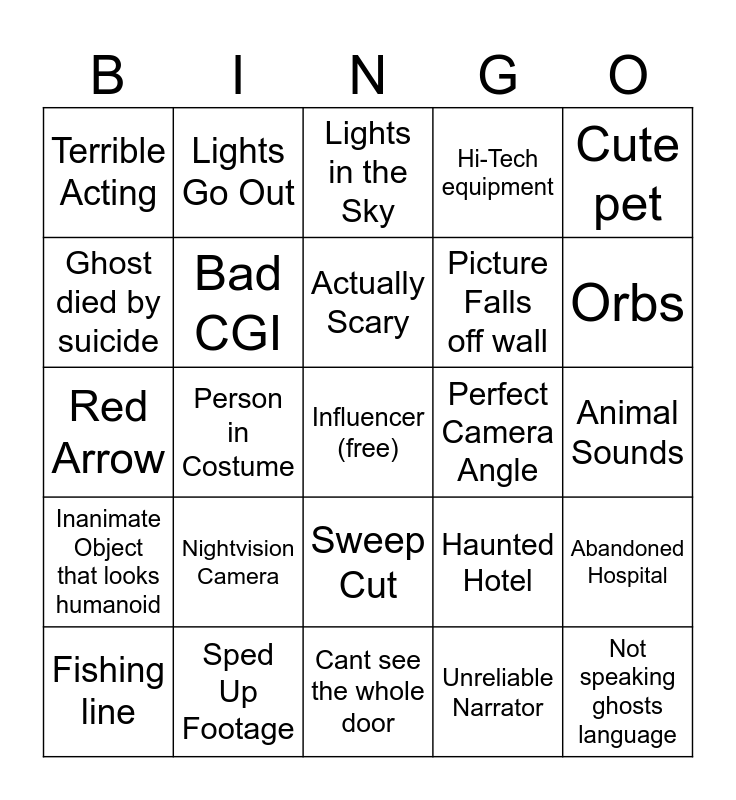 This bingo card has a free space and 39 words: Air currents, Squatter, Just their friend, Bad CGI, Fishing line, Sweep Cut, Actually Scary, Using their child, Cute pet, Inanimate Object that looks humanoid, Person in Costume, Hi-Tech equipment, Not speaking ghosts language, Animal Sounds, Perfect Camera Angle, Nightvision Camera, Actual cool location, Terrible Acting, Item thrown from off screen, Haunted Hotel, Ghost died by suicide, Cant see the whole door, Picture Falls off wall, Orbs, Red Circle, Name Drop Historical Figure, Unintelligible Spirit Box, 3:00 am, Chair Falls Over, Lights Go Out, Dash Cam Footage, Performing a Ritual, Lights in the Sky, Sped Up Footage, Unreliable Narrator, Why was this being filmed?, Abandoned Hospital, Red Arrow and Praying.