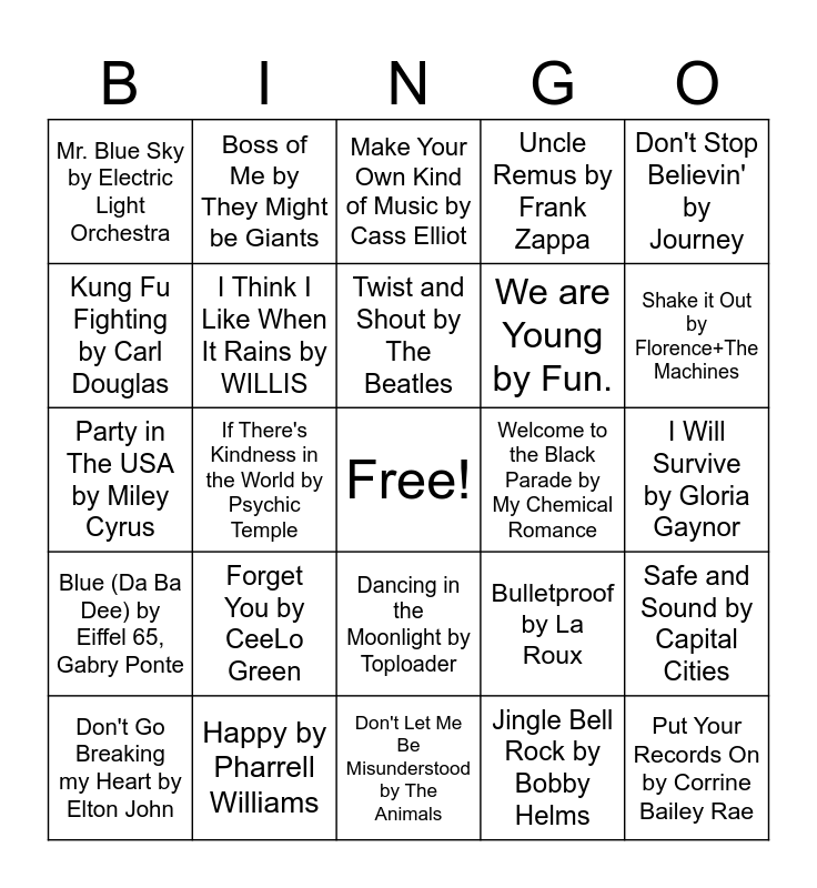 This bingo card has a free space and 24 words: Forget You by CeeLo Green, Happy by Pharrell Williams, Twist and Shout by The Beatles, Don't Go Breaking my Heart by Elton John, Don't Stop Believin' by Journey, Mr. Blue Sky by Electric Light Orchestra, Kung Fu Fighting by Carl Douglas, Boss of Me by They Might be Giants, Welcome to the Black Parade by My Chemical Romance, Dancing in the Moonlight by Toploader, We are Young by Fun., Party in The USA by Miley Cyrus, Bulletproof by La Roux, Safe and Sound by Capital Cities, I Think I Like When It Rains by WILLIS, Jingle Bell Rock by Bobby Helms, I Will Survive by Gloria Gaynor, Make Your Own Kind of Music by Cass Elliot, Shake it Out by Florence+The Machines, If There's Kindness in the World by Psychic Temple, Put Your Records On by Corrine Bailey Rae, Blue (Da Ba Dee) by Eiffel 65, Gabry Ponte, Uncle Remus by Frank Zappa and Don't Let Me Be Misunderstood by The Animals.