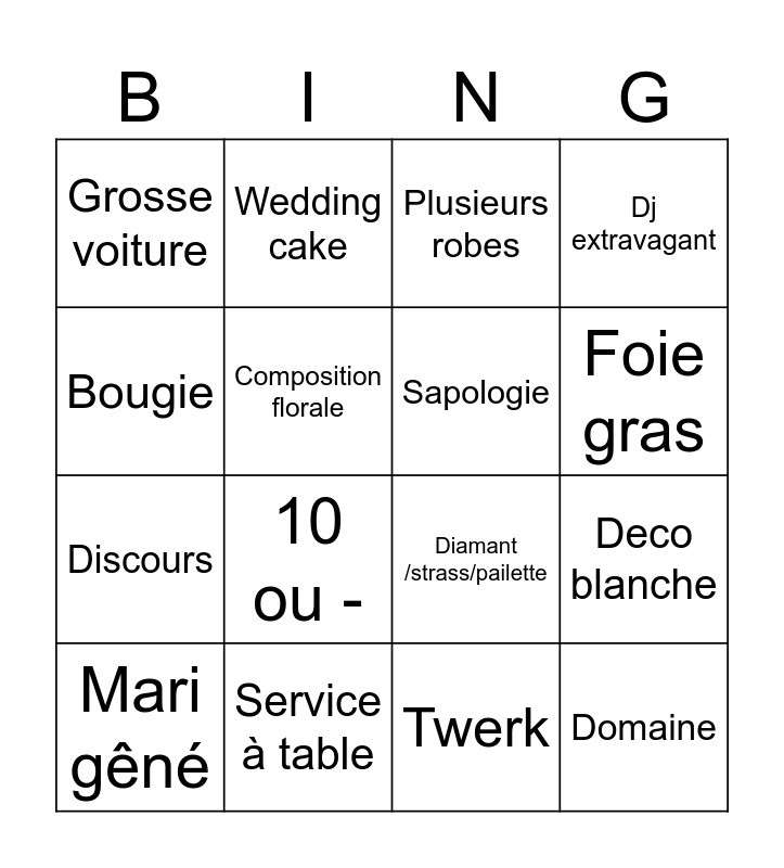 This bingo card has 16 words: Service à table, Deco blanche, Plusieurs robes, Grosse voiture, Discours, Wedding cake, Diamant /strass/pailette, Twerk, Bougie, Composition florale, Mari gêné, Dj extravagant, 10 ou -, Foie gras, Sapologie and Domaine.
