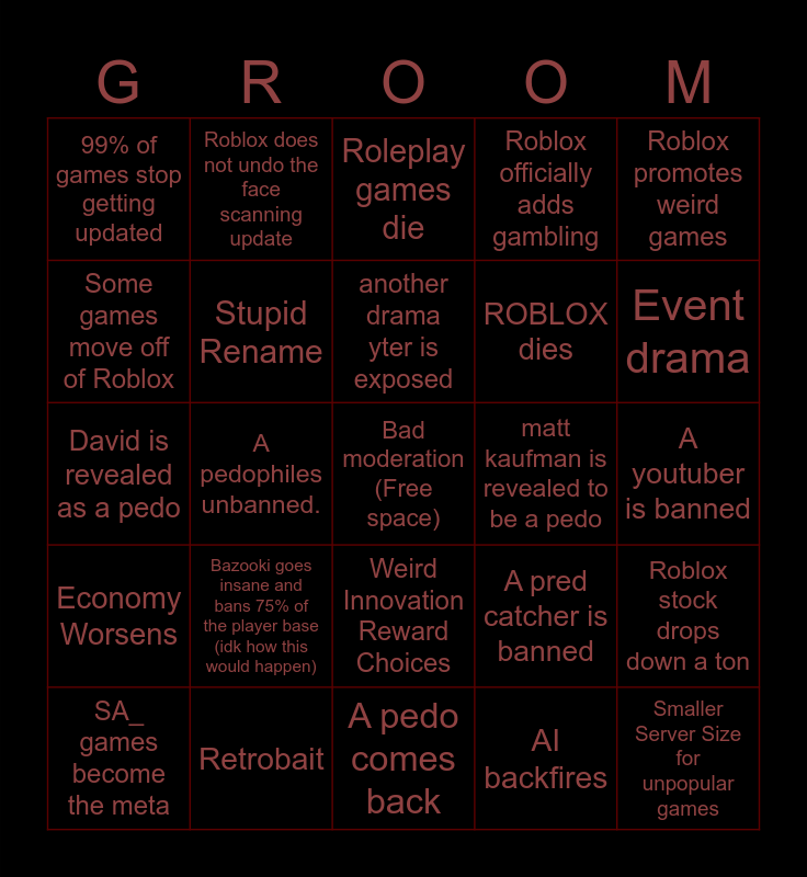 This bingo card has a free space and 24 words: Bazooki goes insane and bans 75% of the player base (idk how this would happen), Retrobait, another drama yter is exposed, SA_ games become the meta, Roblox promotes weird games, 99% of games stop getting updated, Some games move off of Roblox, Roblox does not undo the face scanning update, matt kaufman is revealed to be a pedo, Weird Innovation Reward Choices, ROBLOX dies, David is revealed as a pedo, A pred catcher is banned, Roblox stock drops down a ton, Stupid Rename, AI backfires, A youtuber is banned, Roleplay games die, Event drama, A pedophiles unbanned., Smaller Server Size for unpopular games, Economy Worsens, Roblox officially adds gambling and A pedo comes back.